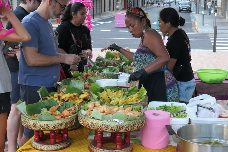 Laut Infoblatt wird die Ankunft des Weihnachtsmannes um 19:00 Uhr erwartet. Wir wollen vorher noch etwas essen und sind bereits um 18:00 Uhr auf dem Festplatz. Bei der Eröffnungsfeier des Lichterfestes hatten wir schon gesehen, dass genau zwei (!) Fressbuden für Hunderte von Besuchern bereitstehen. Eine Bude verkauft Pommes, die andere asiatisches Fingerfood. Lange Schlangen und ein schneller Abverkauf sind die logische Konsequenz. In den letzten Tagen haben wir uns vergewissert, dass wirklich jeden Abend diese Buden auf dem Festplatz aufgebaut sind. Es geht nichts über gewissenhafte Planung – Nouméa hat uns schon einmal geleimt.