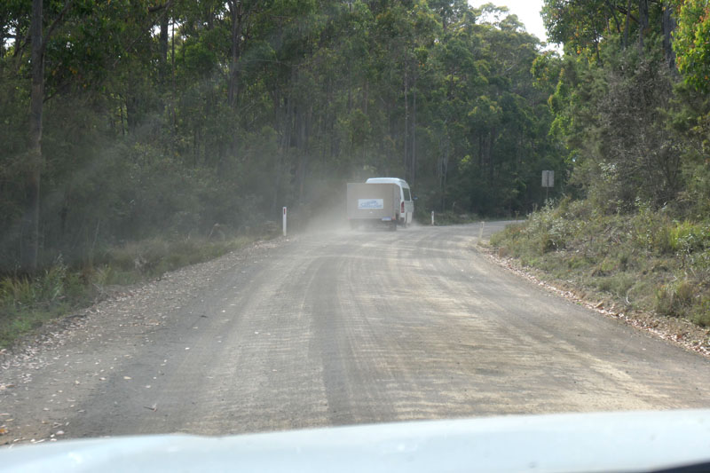 Bis zum Campingplatz sind es nur achtzehn Kilometer. Davon sind zwölf nicht asphaltiert. Angeblich zwölf Kilometer! In echt sind es dreizehn. Das ist ein Trick. Die meisten Autovermietungen sowohl in Australien als auch in Tasmanien erlauben, nur zwölf Kilometer Gravel Road mit nicht 4×4-Wagen zu befahren. Und das auch nur, wenn der Weg unmittelbar zu einer Sehenswürdigkeit oder einem Campingplatz führt. Bei dreizehn Kilometern ist man als Mieter sofort in der Vollhaftung.
