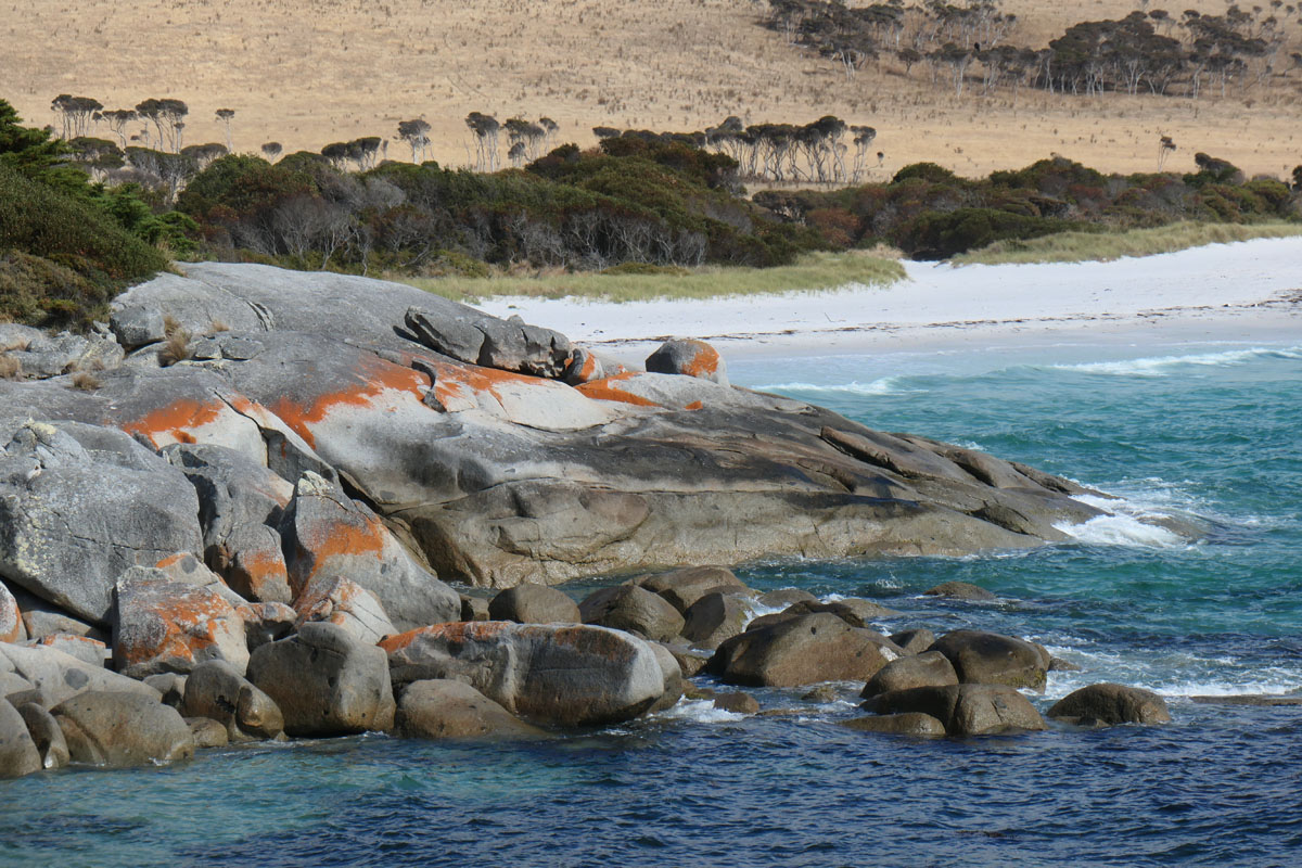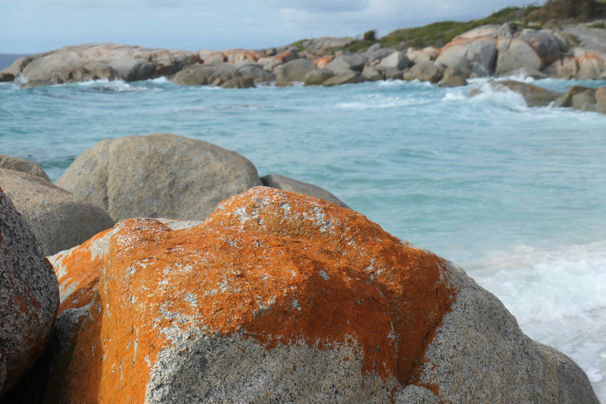 Saubere Luft: Flechten sind empfindlich gegenüber Schadstoffen, Tasmanien liefert Bestbedingungen. Der Untergrund sind Granitfelsen: rau genug zum Festhalten, mineralisch passend. Salzige Meeresluft und Sonne sind Stress für andere Pflanzen. Ort und Gelegenheit für Flechten.