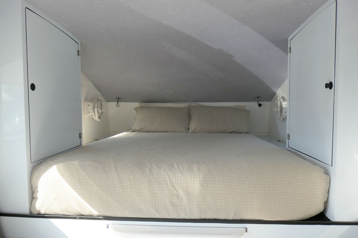 Das Bett ist bequem und lang genug, da wir nicht quer zum Auto schlafen. Gasheizung, 80 Liter Frischwasser und Warmwasseraufbereitung inklusive.