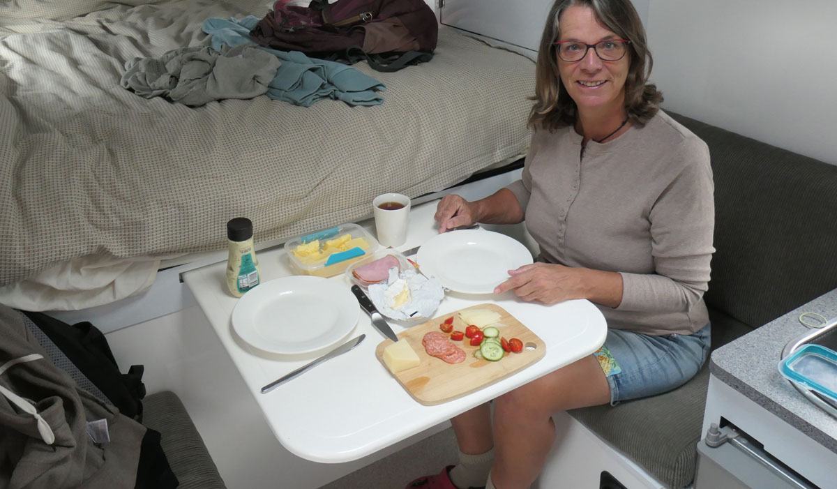 Unser Wagen ist klasse. War die Übergabe auch speziell, so gibt es sonst nichts zu meckern. Mückengaze vor den Fenstern. Alles, was man zum Kochen benötigt, ist dabei. Sogar einen Gurkenhobel und Sparschäler. Ein Starterkit mit Lappen, Müllbeuteln und Geschirrspülmittel. Handfeger und Schaufel.