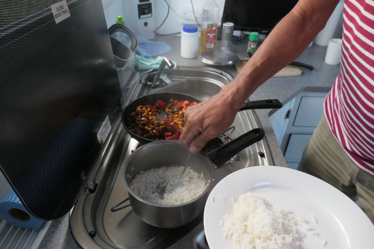 Kochen ist okay in der kleinen Pantry. Ich mache mir das Leben einfach und nehme zum Beispiel fertige Pizzasauce. Das spart tausend Gewürze.