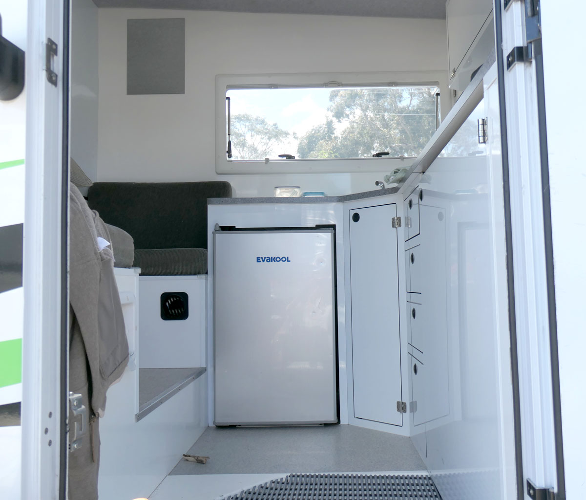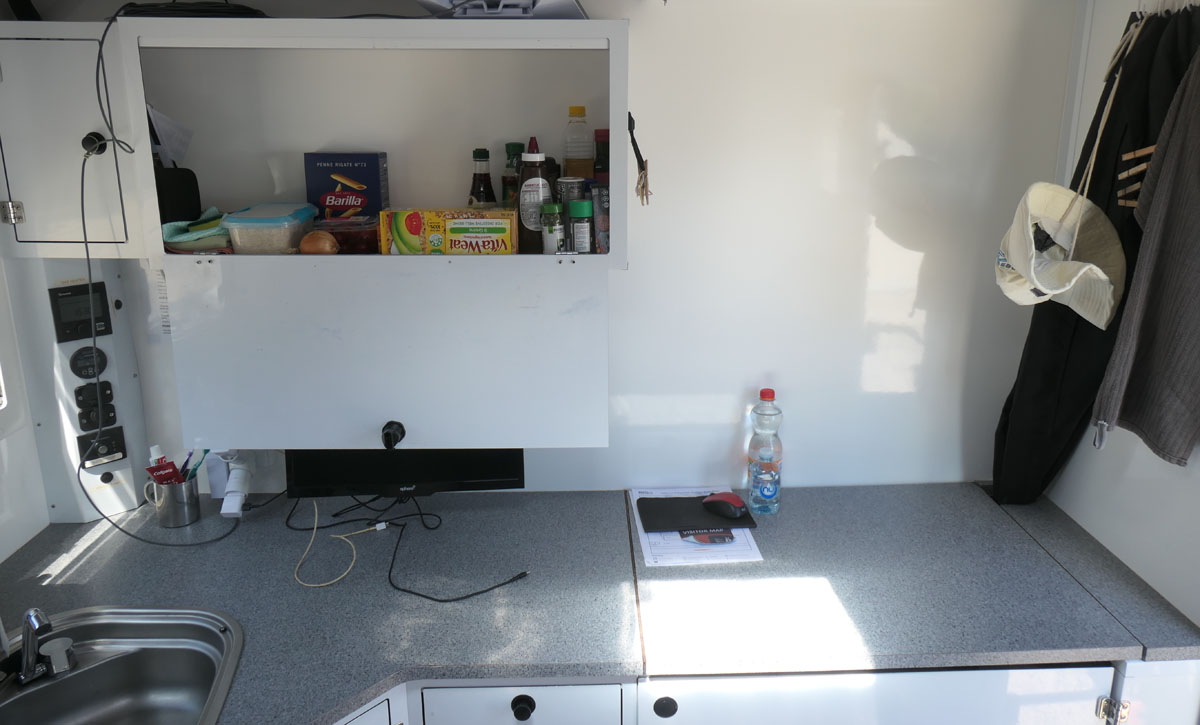 Wenn man die vier Stufen hoch klettert, steht man direkt im „Wohnraum“. Kühlschrank, Spüle, Schubladen und Schränke mit Geschirr. Pass gut. Neben dem Kühlschrank eine von zwei Sitzbänken.