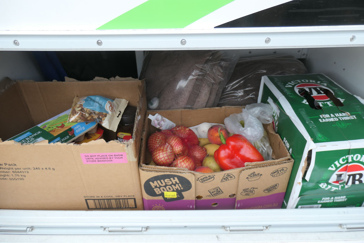 Die Puppenstube ist ein Raumwunder. Unsere Klamotten, Handtücher und persönlichen Sachen sind wir spielend losgeworden. In den Außenfächern lagern bequem die beiden Koffer. Und ein Karton Bier.