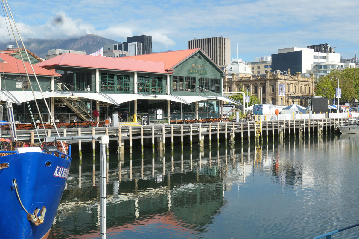 Hobart ist nach Sydney die zweitälteste Stadt Australiens. Die alten Sandsteinspeicher beherbergen heute schicke Bars und Galerien. Jeden Samstag findet dort ein prachtvoller Markt statt, den wir leider verpassen. Aber die Atmosphäre schwappt über.