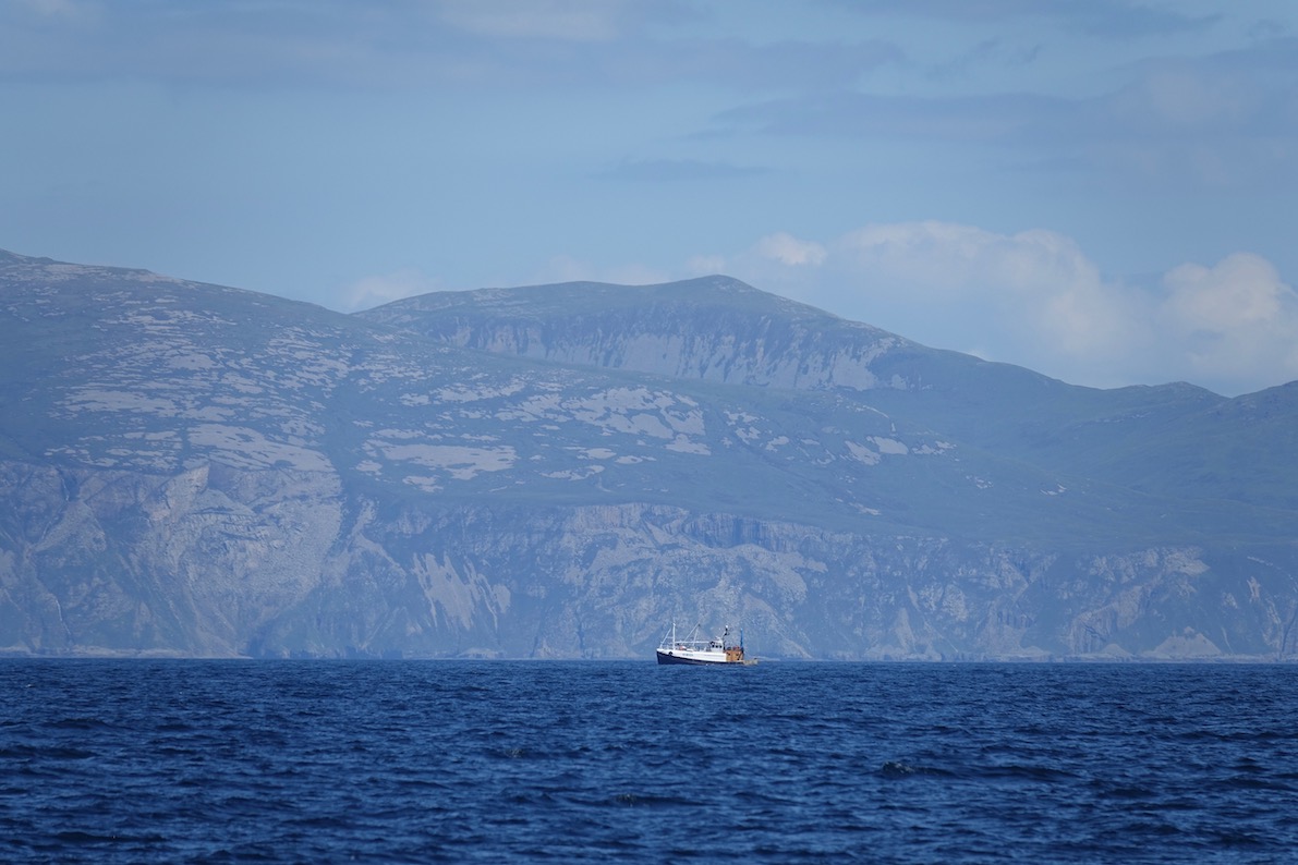 Alles begann mit einem Boot. Einem Boot, das an einem regenverhangenen Morgen wie diesem unter Segeln den schmalen Sund an der Ostseite der Insel ansteuerte und in einem Regenschauer versuchte, nahe genug der Insel zu ankern. Die Szene mag ähnlich gewesen sein. Nur waren auf dem Boot nicht bloß drei Menschen wie auf LEVJE, sondern das Boot war voller Menschen. Sie kamen aus Irland. Und sie waren auf der Flucht.