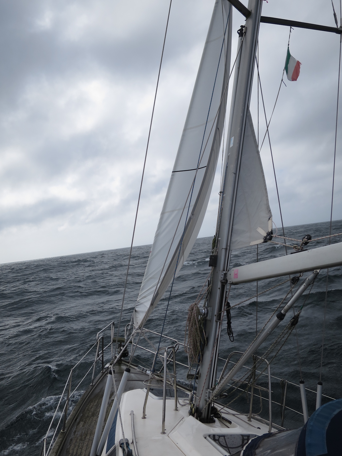 Versuch Nummer 1, wie gelernt: Vorsegel backgestellt, Großschot los, Ruderblatt hart nach Luv: LEVJE liegt nicht mit 50°, sondern mit 90° zum Wind und zur Welle. Fatal – weil sie jede anrollende Welle in Rollen übersetzt und damit der Gang übers Deck zum gefährlichen Abenteuer wird. An Arbeiten unter Deck nicht zu denken ist.