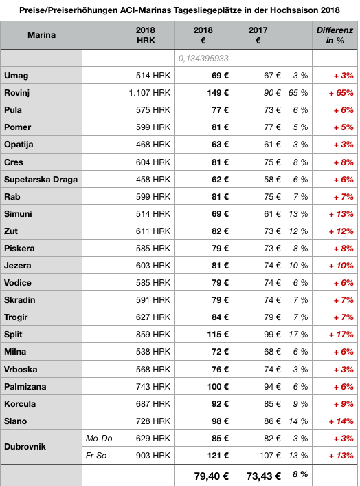 Rechnet man die Liegeplätze in der neuen ACI-Marina Rovinj, deren Eröffnung für Juni 2018 angekündigt ist, mit ein, fällt die Steigerung noch heftiger aus. Die inklusive aller Gebäude und Steganlagen neu errichtete Marina verlangt ausnahmslos für alle Schiffslängen bis 12 Meter pro Tag 1.107 Kuna – umgerechnet 149 €.