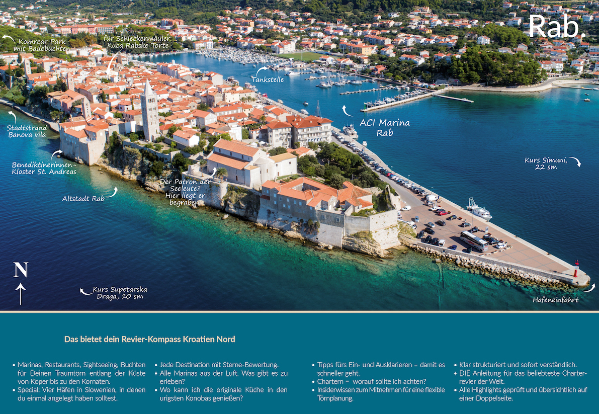 Der Revier-Kompass Kroatien Nord ist anders. Er liefert nicht nur die Highlights entlang der Küste zwischen Koper und Kornaten, an denen man häufig vorbeisegelt oder ahnungslos vorbei läuft. Er zeigt die Highlights auf doppelseitigen Luftbild-Aufnahmen wie in einem Wimmelbild und ausführlichen Texten, was man da alles entdecken kann. Zum Beispiel in Rovinj, wie oben auf dem Cover. Egal, ob man beim ersten Mal wissen will, wo das Bojenfeld liegt, ob ich dort wie der Sohn meiner Frau von der 5 Meter hohen Klippe ins Meer hüpfen (ganz rechts), mit den einheimischen Rovignesi an deren Stadtstrand, der Blaza Ballota im Meer baden oder mal so richtig Abends gepflegt mit der Crew zum Essen gehen will.