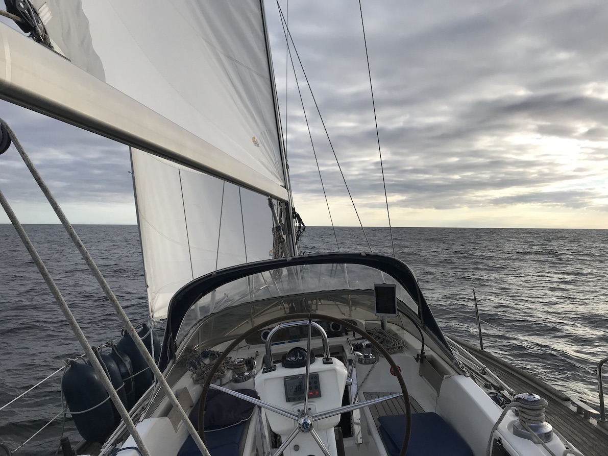 Der Tag war lang, Sven legt sich zur Ruhe, ich übernehme die erste Wache bis Mitternacht, während Levje unter Autopilot in den irischen Sonnenuntergang westwärts Richtung Fastnet Rock segelt.